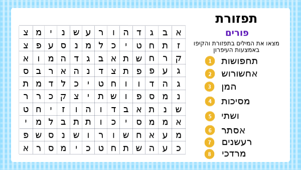 מצאו את המילים בתפזורת והקיפו באמצעות העיפרון
