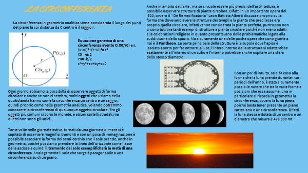 Tante volte nelle giornate estive, tornati da una giornata di mare ci è capitato di osservare magnifici tramonti e con un poca di immaginazione è possibile associare la forma del semi-cerchio che il sole prende, anche in geometria, poiché possiamo prendere la linea dell'orizzonte come l'asse delle ascisse e quindi il tramonto del sole esemplificherà la metà di una circonferenza. Analogamente il sole che sorge è paragonabile a una circonferenza su di un piano.