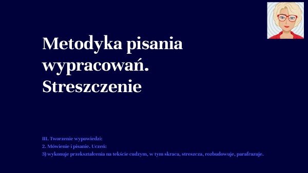 III. Tworzenie wypowiedzi:2. Mówienie i pisanie. Uczeń: 3) wykonuje przekształcenia na tekście cudzym, w tym skraca, streszcza, rozbudowuje, parafrazuje.