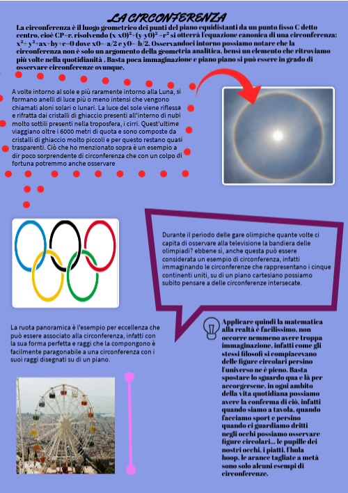 La circonferenza è il luogo geometrico dei punti del piano equidistanti da un punto fisso C detto centro, cioè CP=r. risolvendo (x-x0)²+(y-y0)² =r² si otterrà l'equazione canonica di una circonferenza: x²+ y²+ax+by+c=0 dove x0=-a/2 e y0=-b/2. Osservandoci intorno possiamo notare che la circonferenza non è solo un argomento della geometria analitica, bensì un elemento che ritroviamo più volte nella quotidianità . Basta poca immaginazione e piano piano si può essere in grado di osservare circonferenze ovunque.