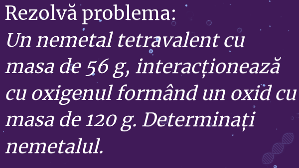 Rezolvă problema:Un nemetal tetravalent cu masa de 56 g, interacționează cu oxigenul formând un oxid cu masa de 120 g. Determinați nemetalul.
