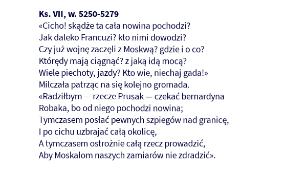 Ks. VII, w. 5250-5279«Cicho! skądże ta cała nowina pochodzi? Jak daleko Francuzi? kto nimi dowodzi? Czy już wojnę zaczęli z Moskwą? gdzie i o co? Którędy mają ciągnąć? z jaką idą mocą? Wiele piechoty, jazdy? Kto wie, niechaj gada!» Milczała patrząc na się kolejno gromada. «Radziłbym — rzecze Prusak — czekać bernardyna Robaka, bo od niego pochodzi nowina; Tymczasem posłać pewnych szpiegów nad granicę, I po cichu uzbrajać całą okolicę, A tymczasem ostrożnie całą rzecz prowadzić, Aby Moskalom naszych zamiarów nie zdradzić».