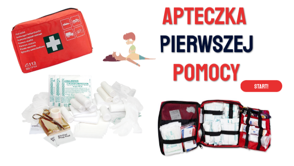 - bandaże, - kompresy, w tym kompresy zimne i kompresy na oko, - opaski elastyczne, - plastry, - sterylne opatrunki indywidualne, - chusty trójkątne, - chusty z fiseliny, - koce ratunkowe, - rękawiczki ochronne lateksowe, - ustnik do sztucznego oddychania, - chusteczki dezynfekujące, - nożyczki oraz instrukcję udzielenie pierwszej pomocy wraz z numerami telefonów alarmowych.