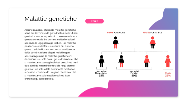 Alcune malattie, chiamate malattie genetiche, sono de-terminate da geni difettosi ricevuti dai genitori e vengono pertanto trasmesse da una generazione all’altra come caratteri ereditari, secondo le leggi della ge-netica. Tali malattie possono manifestarsi in misura più o meno grave o addi-rittura non comparire: dipende dalla combinazione di geni malati e geni sani.Distinguiamo le malattie genetiche in:• dominanti, causate da un gene dominante, che si manifestano sia negliindividui omozigoti per i due alleli dominanti difettosi sia negli eterozi-goti (con un solo allele dominante difettoso);• recessive, causate da un gene recessivo, che si manifestano solo negliomozigoti (con entrambi gli alleli difettosi)