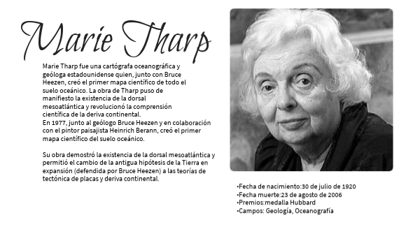 Marie Tharp fue una cartógrafa oceanográfica y geóloga estadounidense quien, junto con Bruce Heezen, creó el primer mapa científico de todo el suelo oceánico. La obra de Tharp puso de manifiesto la existencia de la dorsal mesoatlántica y revolucionó la comprensión científica de la deriva continental.
