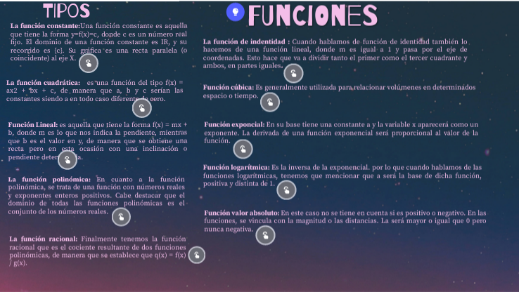 La función racional: Finalmente tenemos la función racional que es el cociente resultante de dos funciones polinómicas, de manera que se establece que q(x) = f(x) / g(x).