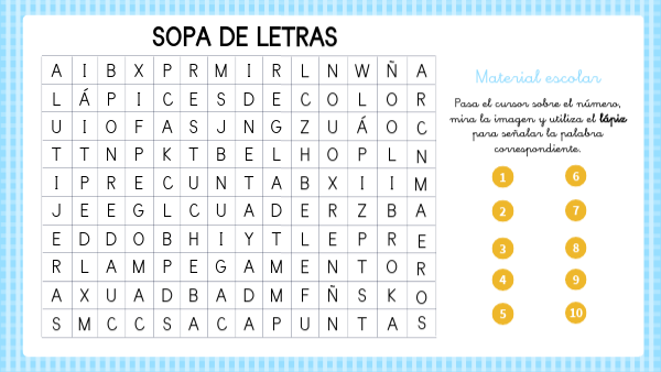 Pasa el cursor sobre el número, mira la imagen y utiliza el lápiz para señalar la palabra correspondiente.