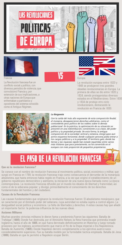 Francia: La Revolución francesa fue un conflicto social y político, con diversos periodos de violencia, que convulsionó Francia y, por extensión de sus implicaciones, a otras naciones de Europa que enfrentaban a partidarios y opositores del sistema conocido como el Antiguo Régimen.