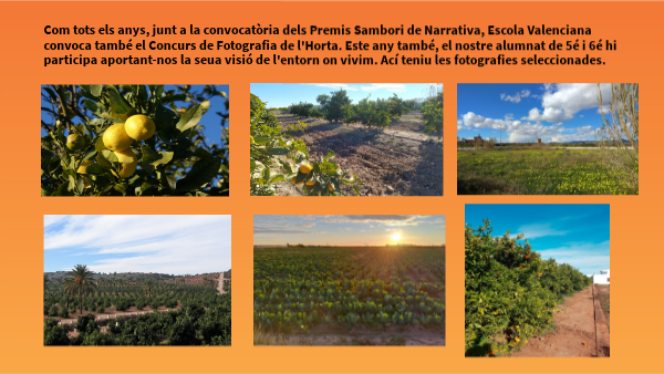 Com tots els anys, junt a la convocatòria dels Premis Sambori de Narrativa, Escola Valenciana convoca també el Concurs de Fotografia de l'Horta. Este any també, el nostre alumnat de 5é i 6é hi participa aportant-nos la seua visió de l'entorn on vivim. Ací teniu les fotografies seleccionades.