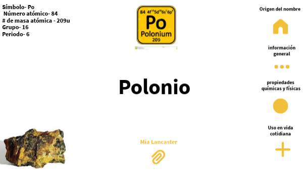 Símbolo- Po Número atómico- 84 # de masa atómica - 209u Grupo- 16 Periodo- 6