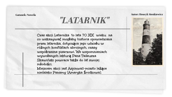 Czas akcji Latarnika to lata 70 XIX wieku na co wskazywać mogłaby historia opowiedziana przez latarnika, dotycząca jego udziału w różnych konfliktach zbrojnych, czasy współczesne pisarzowi. We wspomnieniach wywołanych lekturą Pana Tadeusza Skawiński powraca także do lat swojej młodości.