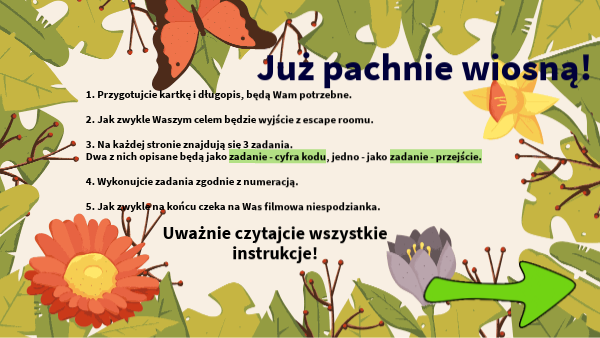 1. Przygotujcie kartkę i długopis, będą Wam potrzebne. 2. Jak zwykle Waszym celem będzie wyjście z escape roomu. 3. Na każdej stronie znajdują się 3 zadania. Dwa z nich opisane będą jako zadanie - cyfra kodu, jedno - jako zadanie - przejście. 4. Wykonujcie zadania zgodnie z numeracją. 5. Jak zwykle na końcu czeka na Was filmowa niespodzianka.
