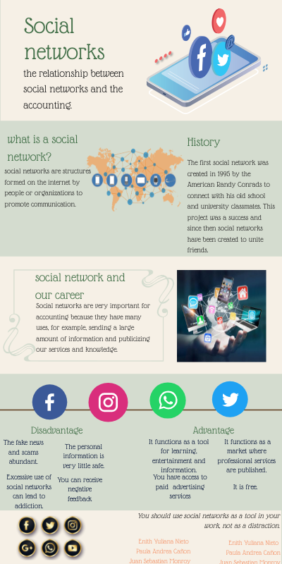 Social networks are very important for accounting because they have many uses, for example, sending a large amount of information and publicizing our services and knowledge.