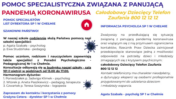 INFORMACJA PSYCHOLGA SP 1 W CHEŁMIEZważywszy na przedłużającą się sytuację związaną z panującą pandemią koronawirusa oraz wiążącym się z nią przymusem ograniczenia kontaktów, Rzecznik Praw Dziecka zainicjował przedsięwzięcie stanowiące jedną z możliwości odpowiedzi na potrzeby dzieci i młodzieży zmagających się z kryzysem psychicznym: całodobowy Dziecięcy Telefon Zaufania 800 12 12 12 Kontakt telefoniczny ma charakter nieodpłatny, a dyżurujący eksperci są osobami profesjonalnie przygotowanymi do udzielania dzieciom i młodzieży wsparcia. Agata Szabała - psycholg SP 1 w Chełmie