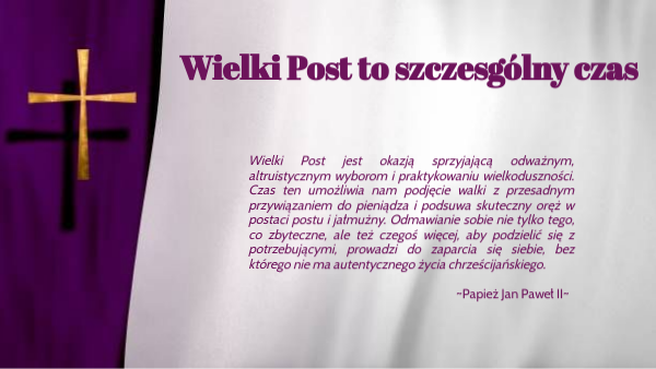 Wielki Post jest okazją sprzyjającą odważnym, altruistycznym wyborom i praktykowaniu wielkoduszności. Czas ten umożliwia nam podjęcie walki z przesadnym przywiązaniem do pieniądza i podsuwa skuteczny oręż w postaci postu i jałmużny. Odmawianie sobie nie tylko tego, co zbyteczne, ale też czegoś więcej, aby podzielić się z potrzebującymi, prowadzi do zaparcia się siebie, bez którego nie ma autentycznego życia chrześcijańskiego. ~Papież Jan Paweł II~