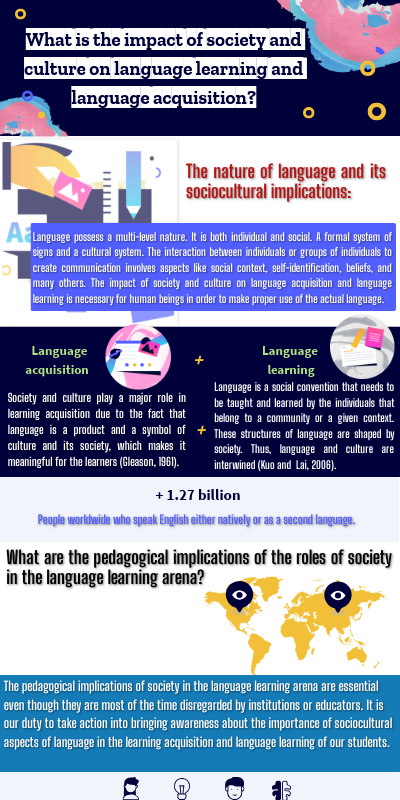 The pedagogical implications of society in the language learning arena are essential even though they are most of the time disregarded by institutions or educators. It is our duty to take action into bringing awareness about the importance of sociocultural aspects of language in the learning acquisition and language learning of our students.