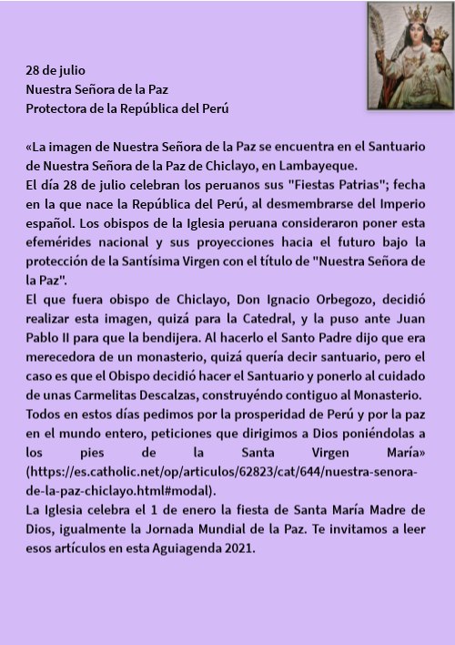28 de julio Nuestra Señora de la Paz Protectora de la República del Perú «La imagen de Nuestra Señora de la Paz se encuentra en el Santuario de Nuestra Señora de la Paz de Chiclayo, en Lambayeque. El día 28 de julio celebran los peruanos sus "Fiestas Patrias"; fecha en la que nace la República del Perú, al desmembrarse del Imperio español. Los obispos de la Iglesia peruana consideraron poner esta efemérides nacional y sus proyecciones hacia el futuro bajo la protección de la Santísima Virgen con el título de "Nuestra Señora de la Paz". El que fuera obispo de Chiclayo, Don Ignacio Orbegozo, decidió realizar esta imagen, quizá para la Catedral, y la puso ante Juan Pablo II para que la bendijera. Al hacerlo el Santo Padre dijo que era merecedora de un monasterio, quizá quería decir santuario, pero el caso es que el Obispo decidió hacer el Santuario y ponerlo al cuidado de unas Carmelitas Descalzas, construyéndo contiguo al Monasterio. Todos en estos días pedimos por la prosperidad de Perú y por la paz en el mundo entero, peticiones que dirigimos a Dios poniéndolas a los pies de la Santa Virgen María» (https://es.catholic.net/op/articulos/62823/cat/644/nuestra-senora-de-la-paz-chiclayo.html#modal). La Iglesia celebra el 1 de enero la fiesta de Santa María Madre de Dios, igualmente la Jornada Mundial de la Paz. Te invitamos a leer esos artículos en esta Aguiagenda 2021.