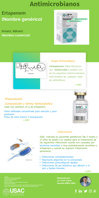 Está indicado en pacientes pediátricos (de 3 meses a 17 años de edad) y en adultos para el tratamiento de las siguientes infecciones cuando son causadas por bacterias sensibles o muy probablemente sensibles a ertapenem y cuando se requiere tratamiento parenteral:
