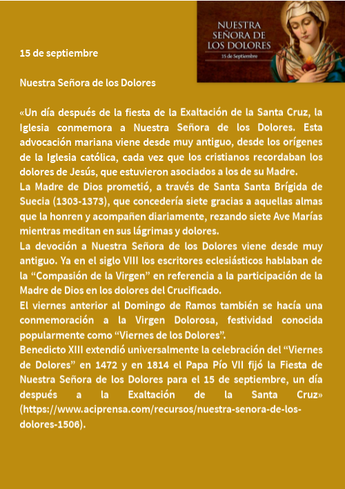 15 de septiembre Nuestra Señora de los Dolores «Un día después de la fiesta de la Exaltación de la Santa Cruz, la Iglesia conmemora a Nuestra Señora de los Dolores. Esta advocación mariana viene desde muy antiguo, desde los orígenes de la Iglesia católica, cada vez que los cristianos recordaban los dolores de Jesús, que estuvieron asociados a los de su Madre. La Madre de Dios prometió, a través de Santa Santa Brígida de Suecia (1303-1373), que concedería siete gracias a aquellas almas que la honren y acompañen diariamente, rezando siete Ave Marías mientras meditan en sus lágrimas y dolores. La devoción a Nuestra Señora de los Dolores viene desde muy antiguo. Ya en el siglo VIII los escritores eclesiásticos hablaban de la “Compasión de la Virgen” en referencia a la participación de la Madre de Dios en los dolores del Crucificado. El viernes anterior al Domingo de Ramos también se hacía una conmemoración a la Virgen Dolorosa, festividad conocida popularmente como “Viernes de los Dolores”. Benedicto XIII extendió universalmente la celebración del “Viernes de Dolores” en 1472 y en 1814 el Papa Pío VII fijó la Fiesta de Nuestra Señora de los Dolores para el 15 de septiembre, un día después a la Exaltación de la Santa Cruz» (https://www.aciprensa.com/recursos/nuestra-senora-de-los-dolores-1506).