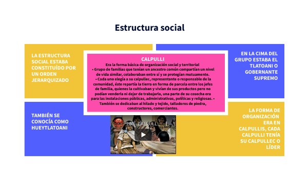 Era la forma básica de organización social y territorial • Grupo de familias que tenían un ancestro común compartían un nivel de vida similar, colaboraban entre sí y se protegían mutuamente. • Cada uno elegía a su calpullec, representante o responsable de la comunidad, éste repartía la tierra en forma de parcela entre los jefes de familia, quienes la cultivaban y vivían de sus productos pero no podían venderla ni dejar de trabajarla, una parte de su cosecha era para las instalaciones públicas, administrativas, políticas y religiosas. • También se dedicaban al hilado y tejido, talladores de piedra, constructores, comerciantes.