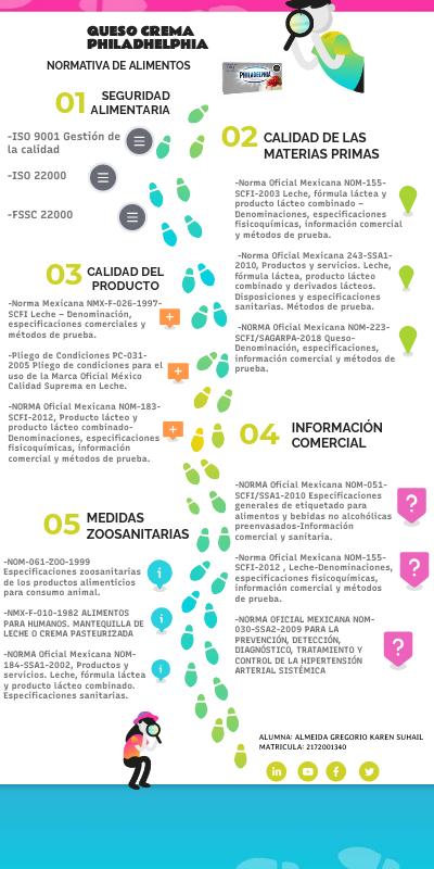 -Norma Oficial Mexicana NOM-155-SCFI-2003 Leche, fórmula láctea y producto lácteo combinado – Denominaciones, especificaciones fisicoquímicas, información comercial y métodos de prueba. -Norma Oficial Mexicana 243-SSA1-2010, Productos y servicios. Leche, fórmula láctea, producto lácteo combinado y derivados lácteos. Disposiciones y especificaciones sanitarias. Métodos de prueba. -NORMA Oficial Mexicana NOM-223-SCFI/SAGARPA-2018 Queso-Denominación, especificaciones, información comercial y métodos de prueba.