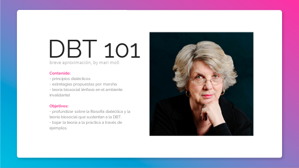 Contenido: - principios dialécticos - estretagias propuestas por marsha - teoría biosocial (énfasis en el ambiente invalidante) Objetivos: - profundizar sobre la filosofía dialéctica y la teoría biosocial que sustentan a la DBT. - bajar la teoría a la práctica a través de ejemplos.