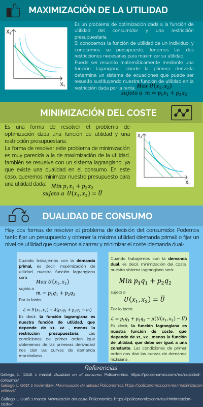 Hay dos formas de resolver el problema de decisión del consumidor. Podemos tanto fijar un presupuesto y obtener la máxima utilidad (demanda primal) o fijar un nivel de utilidad que queremos alcanzar y minimizar el coste (demanda dual).