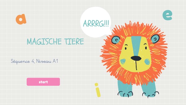 - Lexique: animaux, couleurs, caractère, description physique, activités, film - Grammaire: adjectif attribut, le présent de l'indicatif au présent, le verbe de modalité können - Culturel: l'album de jeunesse "das Neinhorn", le film die Schule der magischen Tiere