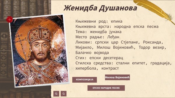 Књижевни род: епикаКњижевна врста: народна епска песма Тема: женидба јунака Место радње: Леђан Ликови: српски цар Стјепане, Роксанда, Мијаило, Милош Војиновић, Тодор везир, Балачко војвода Стих: епски десетерац Стилска средства: стални епитет, градација, хипербола, контраст