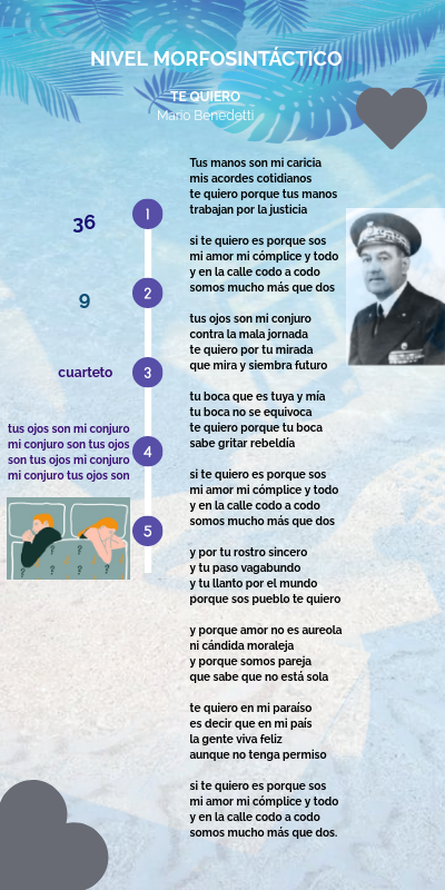 Tus manos son mi caricia mis acordes cotidianos te quiero porque tus manos trabajan por la justicia si te quiero es porque sos mi amor mi cómplice y todo y en la calle codo a codo somos mucho más que dos tus ojos son mi conjuro contra la mala jornada te quiero por tu mirada que mira y siembra futuro tu boca que es tuya y mía tu boca no se equivoca te quiero porque tu boca sabe gritar rebeldía si te quiero es porque sos mi amor mi cómplice y todo y en la calle codo a codo somos mucho más que dos y por tu rostro sincero y tu paso vagabundo y tu llanto por el mundo porque sos pueblo te quiero y porque amor no es aureola ni cándida moraleja y porque somos pareja que sabe que no está sola te quiero en mi paraíso es decir que en mi país la gente viva feliz aunque no tenga permiso si te quiero es porque sos mi amor mi cómplice y todo y en la calle codo a codo somos mucho más que dos.