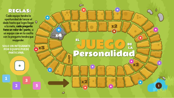 Cada equipo tendra la oportunidad de lanzar el dado hasta que logre llegar a la meta, cada pregunta tiene un valor de 1 punto, si un equipo cae en la casilla con la pregunta tendra que responder.