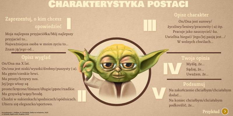 On/Ona jest surowy/życzliwy/leniwy/pracowity (-a) itp. Pracuje jako nauczyciel/-ka. Uwielbia biegać/ Jego/Jej pasją jest.../ W wolnych chwilach...