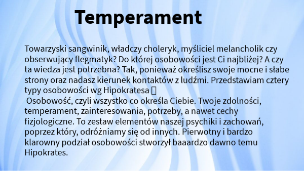 Towarzyski sangwinik, władczy choleryk, myśliciel melancholik czy obserwujący flegmatyk? Do której osobowości jest Ci najbliżej? A czy ta wiedza jest potrzebna? Tak, ponieważ określisz swoje mocne i słabe strony oraz nadasz kierunek kontaktów z ludźmi. Przedstawiam cztery typy osobowości wg Hipokratesa 🙂 Osobowość, czyli wszystko co określa Ciebie. Twoje zdolności, temperament, zainteresowania, potrzeby, a nawet cechy fizjologiczne. To zestaw elementów naszej psychiki i zachowań, poprzez który, odróżniamy się od innych. Pierwotny i bardzo klarowny podział osobowości stworzył baaardzo dawno temu Hipokrates.