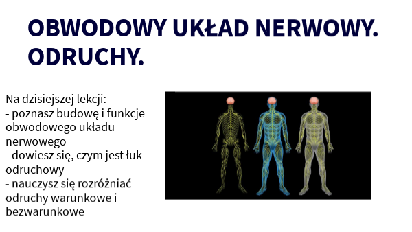 Na dzisiejszej lekcji: - poznasz budowę i funkcje obwodowego układu nerwowego - dowiesz się, czym jest łuk odruchowy - nauczysz się rozróżniać odruchy warunkowe i bezwarunkowe