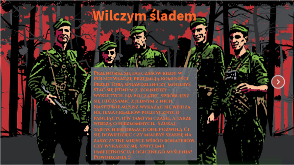 Przenosisz się do czasów kiedy w Polsce władzę przejmują komuniści. Przed Tobą sprawdzian czy mógłbyś stać się jednym z żołnierzy wyklętych. Na początku spróbujesz się utożsamić z jednym z nich. Następnie musisz wykazać się wiedzą na temat realiów politycznych panujących w tamtym czasie, a także wiedzą o niezłomnych. SZukaj tajnych informacji one pozwolą Ci się dowiedzieć czy miałbyś szansę na zaszczytne miejsce wśród bohaterów. czy wykażesz się sprytem i umiejętnością logicznego myślenia? Powodzenia :)