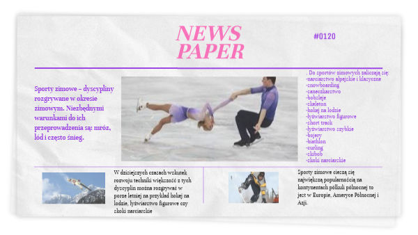 . Do sportów zimowych zaliczają się: -narciarstwo alpejskie i klasyczne -snowboarding -saneczkarstwo -bobsleje -skeleton -hokej na lodzie -łyżwiarstwo figurowe -short track -łyżwiarstwo szybkie -bojery -biathlon -curling -skibob -skoki narciarskie