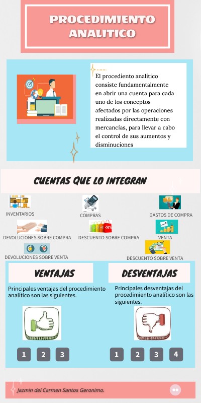 El procediento analitico consiste fundamentalmente en abrir una cuenta para cada uno de los conceptos afectados por las operaciones realizadas directamente con mercancías, para llevar a cabo el control de sus aumentos y disminuciones