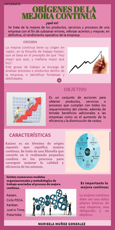 La mejora continua tiene su origen en Japón, en la filosofía de trabajo Kaizen, que se basa en el precepto de que “Hoy mejor que ayer, y mañana mejor que hoy”. Este grupo de trabajo se encarga de analizar procesos o productos dentro de la empresa, e identificar fortalezas y debilidades.