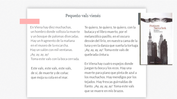 El poema “Pequeño vals vienés” está incluido en el libro de poesía Poeta en Nueva York, uno de los mejores libros de poesía de Lorca, editado por primera vez en México y en Estados Unidos en 1940, cuando el autor ya había sido brutalmente asesinato en la Guerra Civil española. Lorca fue exiliado en la muerte, dejó de leerse, de estudiarse y de publicarse en la España de la posguerra y la dictadura. El poeta llega a Nueva York en 1929 para hacer un curso de inglés y dar conferencias en distintas universidades americanas, y esa ciudad le impacta profundamente. Esta etapa representa y define el surrealismo lorquiano. El rechazo hacia una civilización “desnaturalizada” se plasma en esta obra en la que Lorca vuelve a ponerse del lado de los oprimidos: los negros, los excluidos del bienestar social, los niños… El surrealismo de esta época lleva los símbolos y las metáforas al extremo; y hace que en todo el libro se viva una especie de caos y confusión, de sueño destructivo. Sin embargo, en el “Pequeño Vals vienés”, uno de los últimos poemas del libro, no encontramos esta temática. Es un poema de amor, de amor profundo y de amor desesperado. Es un poema y una canción que se mueve a ritmo de vals según lo vamos leyendo. Es una música que resuena en nuestros oídos con la pronunciación de cada palabra. Es la plasmación de un sueño misterioso en el que van apareciendo elementos contrarios que nos hablan de amor, de belleza y de vida, pero también de muerte y de dolor. Hay diez muchachas, pero también un hombro donde solloza la muerte. Hay un fragmento de la mañana, pero está en el museo de la escarcha. Hay palomas, pero están disecadas. Hay frescas guirnaldas, pero son de llanto. Hay lirios, pero son de nieve. El violín es también un sepulcro. Hay un vals que es al mismo tiempo muerte y coñac. Es un poema de amor, pero de amor frustrado, en el que los sugieren y nos hacen sentir. Todo es misterio. No podemos ni debemos encontrar una comprensión racional, poruqe no la hay. Esto es lo típico del movimiento surrealista. Tenemos que dejarnos llevar por la intuición y por el sentimiento que nos produce.