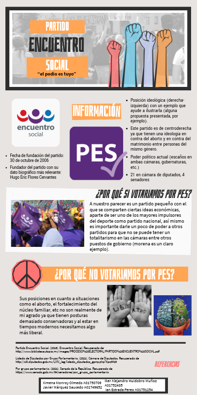 Partido Encuentro Social. (2018). Encuentro Social. Recuperado de: http://www.bibliotecautopia.mx/images/PROCESO%20ELECTORAL/PARTIDO%20ENCUENTRO%20SOCIAL.pdf Listado de Diputados por Grupo Parlamentario. (2021). Cámara de Diputados. Recuperado de http://sitl.diputados.gob.mx/LXIV_leg/listado_diputados_gpnp.php?tipot=15 Por grupo parlamentario. (2021). Senado de la República. Recuperado de https://www.senado.gob.mx/64/senadores/por_grupo_parlamentario