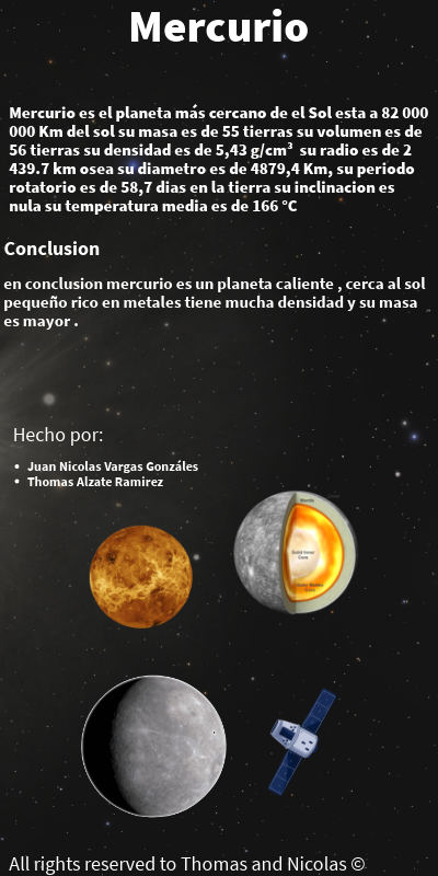 en conclusion mercurio es un planeta caliente , cerca al sol pequeño rico en metales tiene mucha densidad y su masa es mayor .