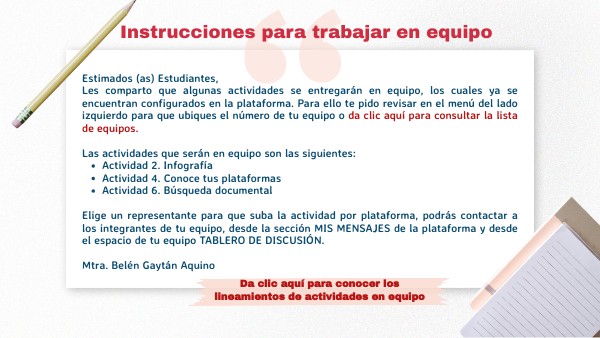 Estimados (as) Estudiantes, Les comparto que algunas actividades se entregarán en equipo, los cuales ya se encuentran configurados en la plataforma. Para ello te pido revisar en el menú del lado izquierdo para que ubiques el número de tu equipo o da clic aquí para consultar la lista de equipos. Las actividades que serán en equipo son las siguientes: