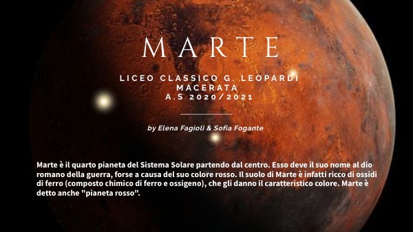 Marte è il quarto pianeta del Sistema Solare partendo dal centro. Esso deve il suo nome al dio romano della guerra, forse a causa del suo colore rosso. Il suolo di Marte è infatti ricco di ossidi di ferro (composto chimico di ferro e ossigeno), che gli danno il caratteristico colore. Marte è detto anche "pianeta rosso".