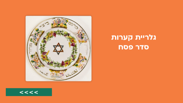קערת פסח מרוקעת תוצרת "בצלאל". במרכז הקערה חלק מהטקסט של "מה נשתנה" מההגדה של פסח. מסביב לטקסט חמש שקערוריות למאכלים הסמליים. במעגל החיצוני מתוארות סצנות מקראיות (עבודת הפרך במצרים, יציאת מצרים, הכוהנים הנושאים את ארון הברית ועוד).