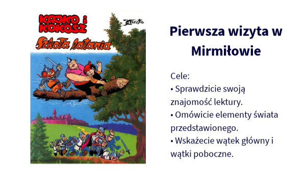 Cele:• Sprawdzicie swoją znajomość lektury. • Omówicie elementy świata przedstawionego. • Wskażecie wątek główny i wątki poboczne.