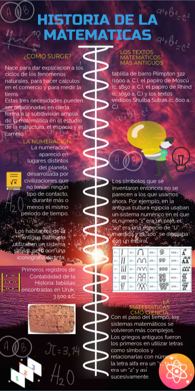 Nace para dar explicacion a los ciclos de los fenomenos naturales, para hacer calculos en el comercio y para medir la tierra.Estas tres necesidades pueden ser relacionadas en cierta forma a la subdivisión amplia de la matemática en el estudio de la estructura, el espacio y el cambio.