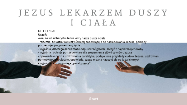 CELE LEKCJI. Uczeń: -wie, że w Eucharystii Jezus leczy nasze dusze i ciała, - rozumie, że udział we Mszy Świętej zobowiązuje do naśladowania Jezusa, pomocy potrzebującym, przemiany życia - wyjaśnia, dlaczego Jezus może odpuszczać grzech i leczyć z najcięższej choroby - wyjaśnia i opisuje potrzebę wiary dla zrozumienia słów i czynów Jezusa - opowiada o cudzie uzdrowienia paralityka, podaje inne przykłady cudów Jezusa, uzdrowień, pomocy potrzebującym, opowiada, czego można nauczyć się od ludzi chorych - wyjaśniana czym polega „paraliż serca”
