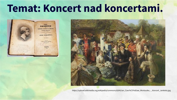 1. Koncert Jankiela na cymbałach został opisany w Księdze XII "Pana Tadeusza". Spróbujcie najpierw przypomnieć sobie, jakie były jego okoliczności.