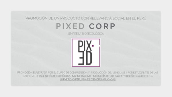 LA PROMOCIÓN DE LA COMPAÑIA PIXED CORP HA SIDO REALIZADA COMO PARTE DEL CURSO COMPRENSIÓN Y PRODUCCIÓN DEL LENGUAJE II, POR LOS SIGUIENTES ESTUDIANTES: