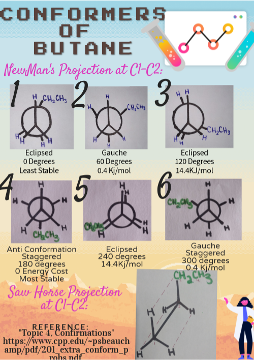 Anti Conformation Staggered 180 degrees 0 Energy Cost Most Stable